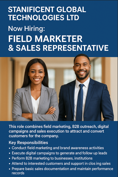 This position combines field marketing, sales execution, customer engagement and telemarketing. The staff will promote company products to individuals and businesses, handle inquiries, follow-up leads, and close sales both physically (field/in-store) and digitally (phone/WhatsApp/ online). The role also covers B2B marketing – reaching out to corporate clients, schools, hotels, churches, companies, etc.