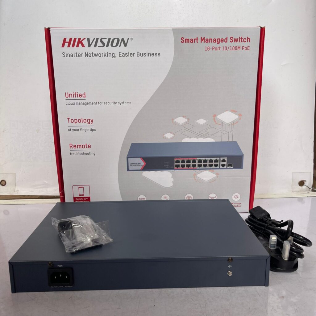 Perfect for IP surveillance systems, VoIP phones, Wi-Fi access points, and enterprise networks, the Hikvision 16-Port PoE Network Switch combines performance, power, and simplicity in one compact unit. Whether you’re setting up a new network or upgrading your current one, this PoE switch delivers both power and reliability.