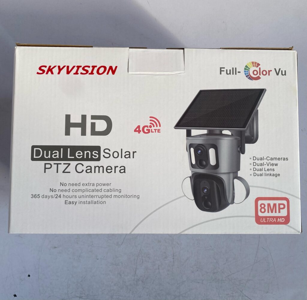 Secure your property with the Skyvision 8MP 4G Dual Lens Solar PTZ Big Outdoor Camera with Auto Tracking (Black, UBOX App) – a premium solar-powered CCTV solution designed for outdoor surveillance in Nigeria’s urban and rural areas.
